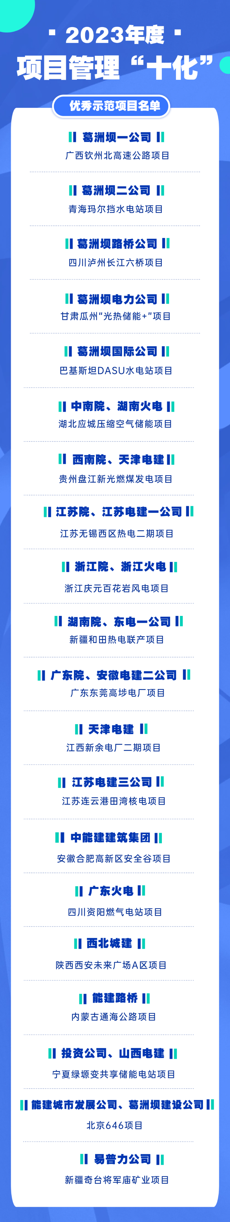 news工程項(xiàng)目是企業(yè)發(fā)展的命脈,是價(jià)值創(chuàng)造的源泉,是品牌提升的“硬公關(guān)”。2023 年,中國能建以“項(xiàng)目履約提升年”專項(xiàng)行動(dòng)為契機(jī),全級(jí)次狠抓項(xiàng)目管理“十化”落地,深入開展優(yōu)秀示范項(xiàng)目的創(chuàng)建工作,持續(xù)推動(dòng)項(xiàng)目管理向科學(xué)化、數(shù)字化轉(zhuǎn)變。為表彰先進(jìn)、樹立典型,經(jīng)所屬企業(yè)推薦、公司組織評(píng)選,決定授予20個(gè)項(xiàng)目“2023年度項(xiàng)目管理‘十化’優(yōu)秀示范項(xiàng)目”榮譽(yù)稱號(hào)。